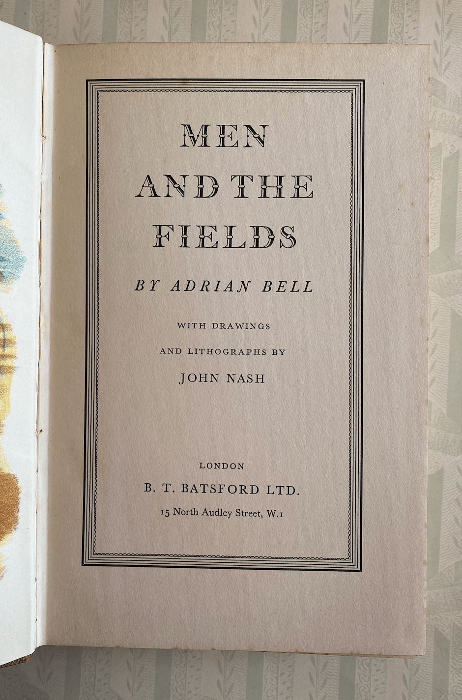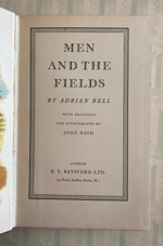 Men And The Fields by Adrian Bell B T Batsford London 1939 1st edition. Dust jacket illustrated by John Nash 156pp inc 6 colour plates and 20 b/w line drawings all very clean and bright.