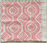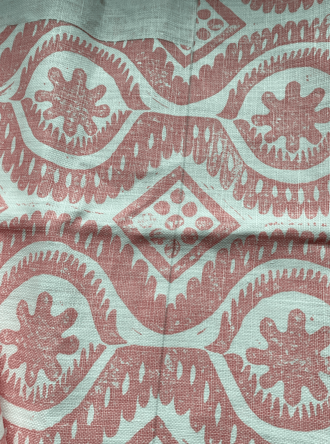 Heavy linen, and hand printed in England, this is beautiful quality fabric. The design is a soft muted pink printed on a soft off white linen cloth.